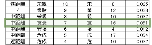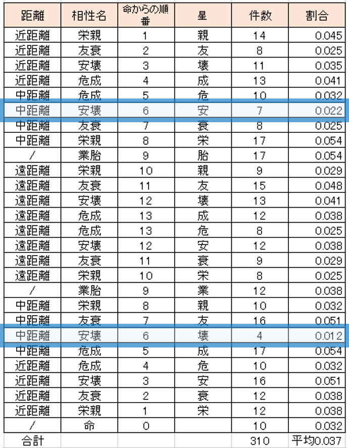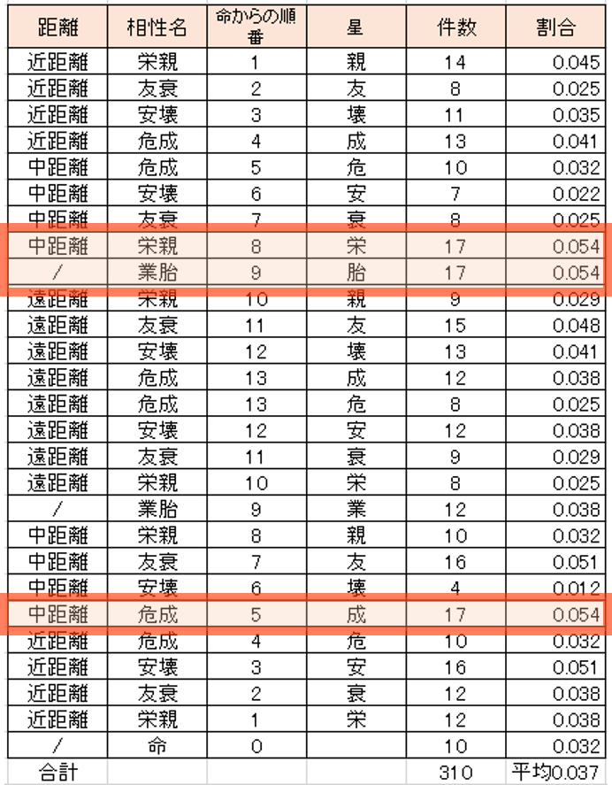 (命・業胎は相性自体が成立する組み合わせが半分なため件数を2倍して計算しています)