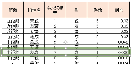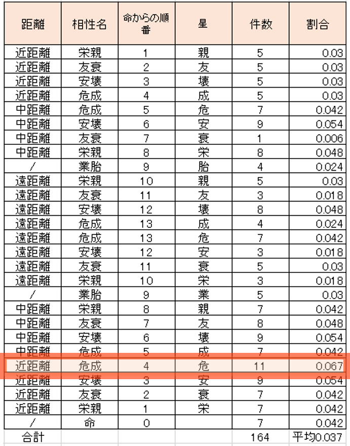 (命・業胎は相性自体が成立する組み合わせ数が半分なため件数を2倍して計算しています)