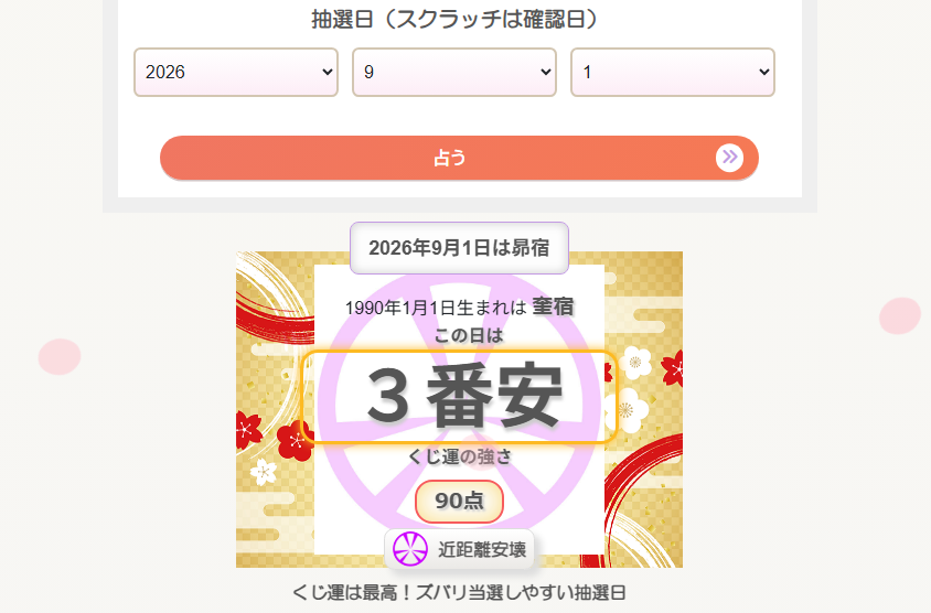 「くじ運を占う」のページでは生年月日と抽選日を入力するだけで、当選しやすいかカンタンに占うことができます。