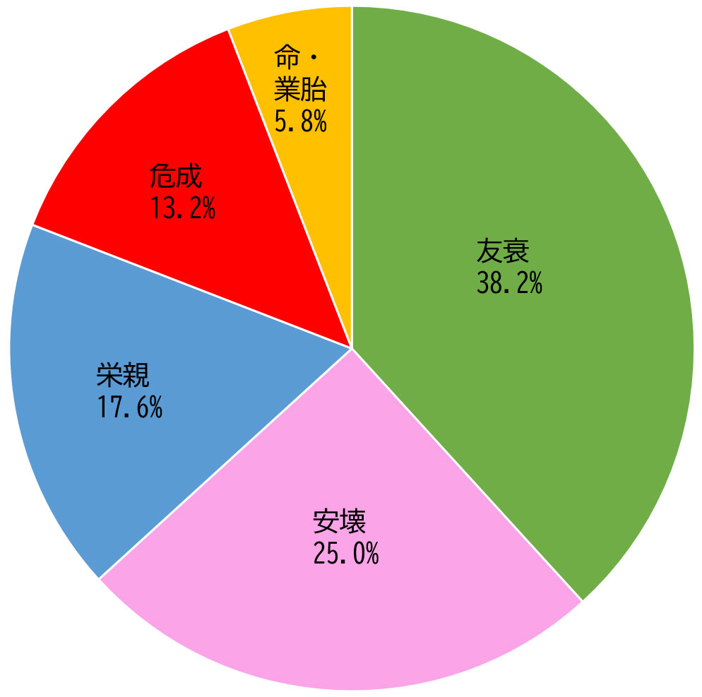 また2番目に多い安壊の相性も、友衰と同じ「変動の属性」を持つ相性です。物事を変える運気を生じさせやすいです。