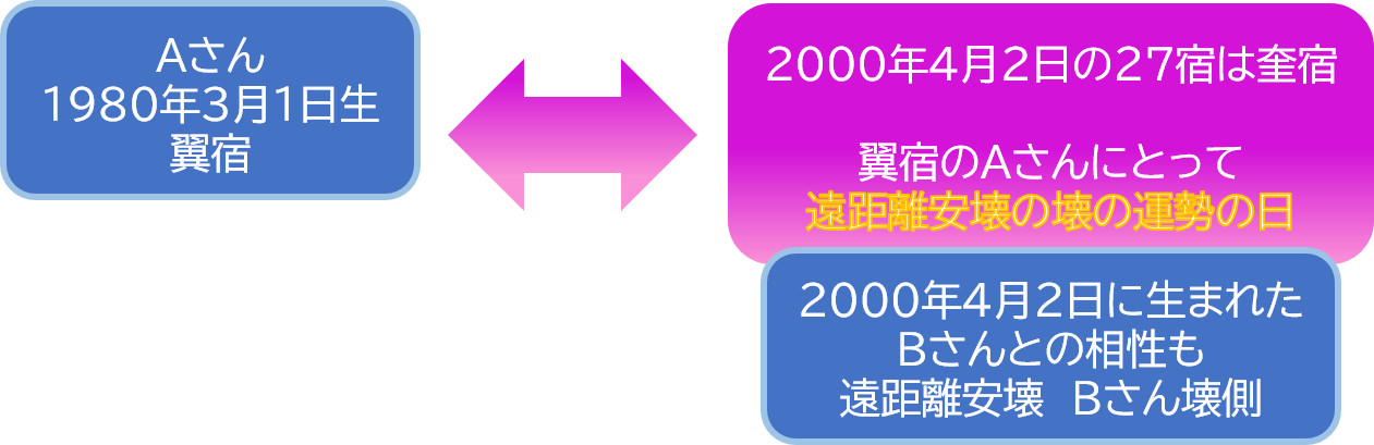 たとえば、1980年3月1日生まれ:翼宿のAさんと、2000年4月2日生まれ:奎宿のBさんがいたとき